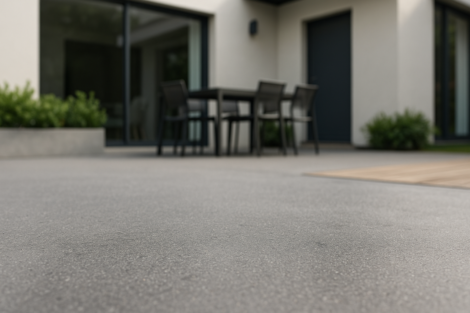 Les options de finition, c’est là où une terrasse devient vraiment personnelle. Mat pour un rendu sobre, satiné pour un sol plus lumineux, ou texture avec granulats pour sécuriser les zones mouillées. Certaines options imitent un effet minéral, d’autres jouent la continuité très contemporaine. Il existe aussi des effets quartz, paillettes, ou touches type marbre… mais attention : plus c’est “déco”, plus la salissure peut se voir selon la teinte.